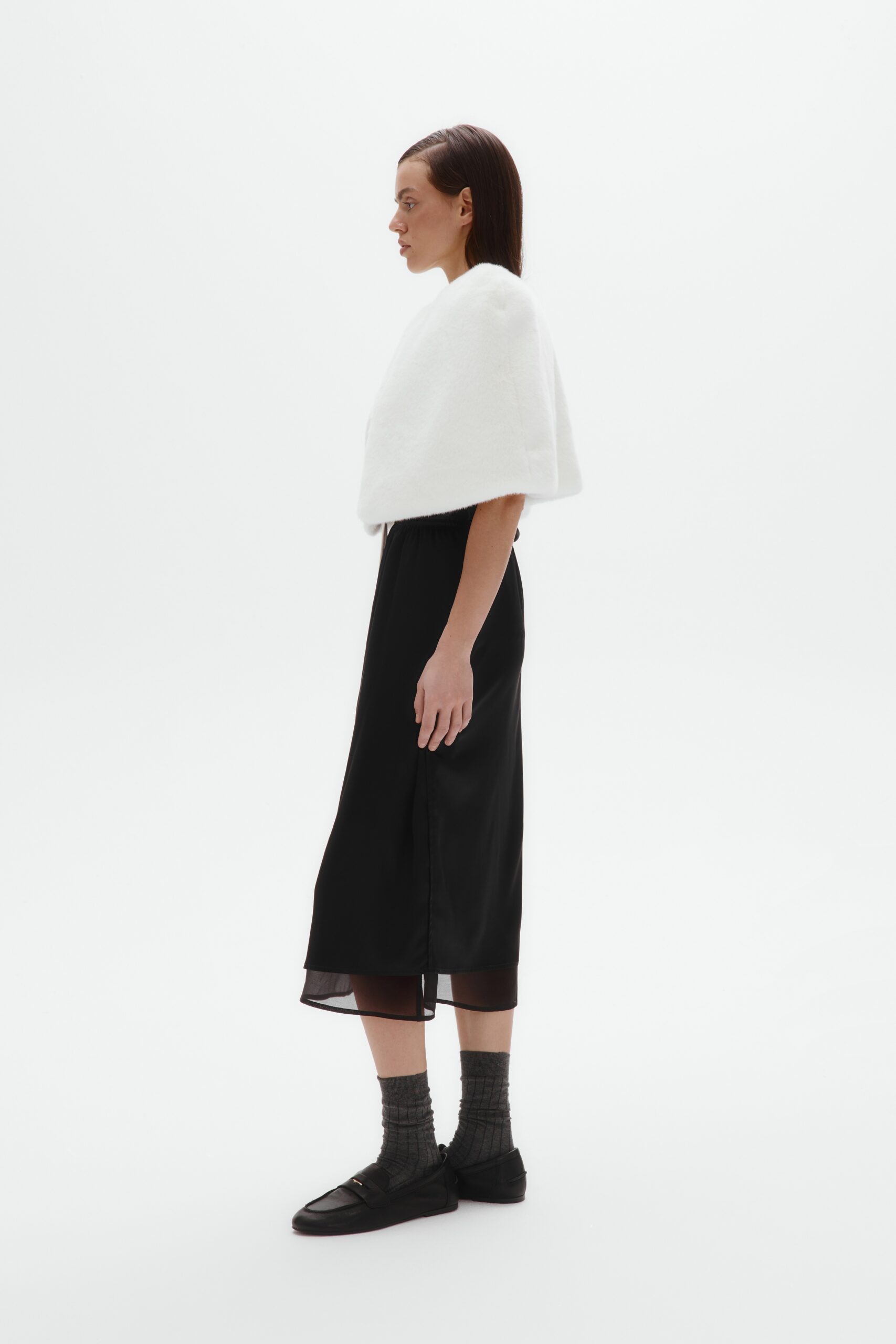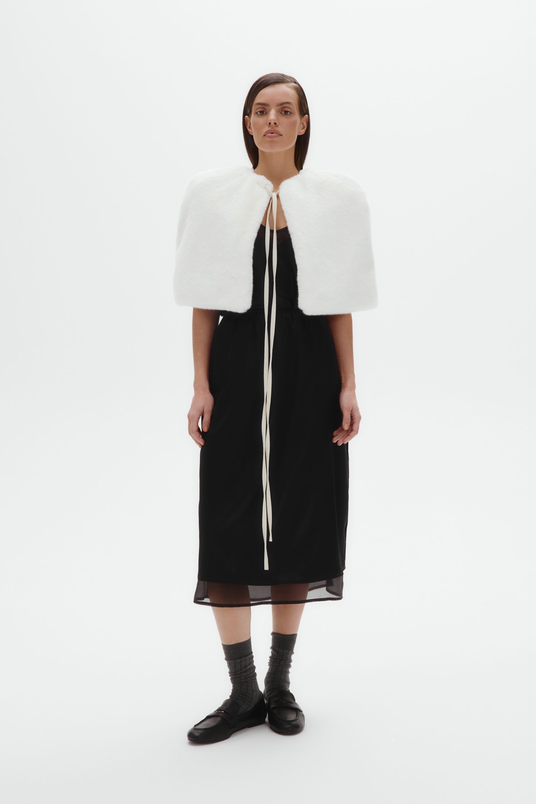 Универсальный кейп, который носят поверх жакета для тёплого повседневного образа или как элегантную накидку для вечера. Структурные плечевые вставки обеспечивают безупречную посадку. Сдержанная роскошь в каждой детали.
