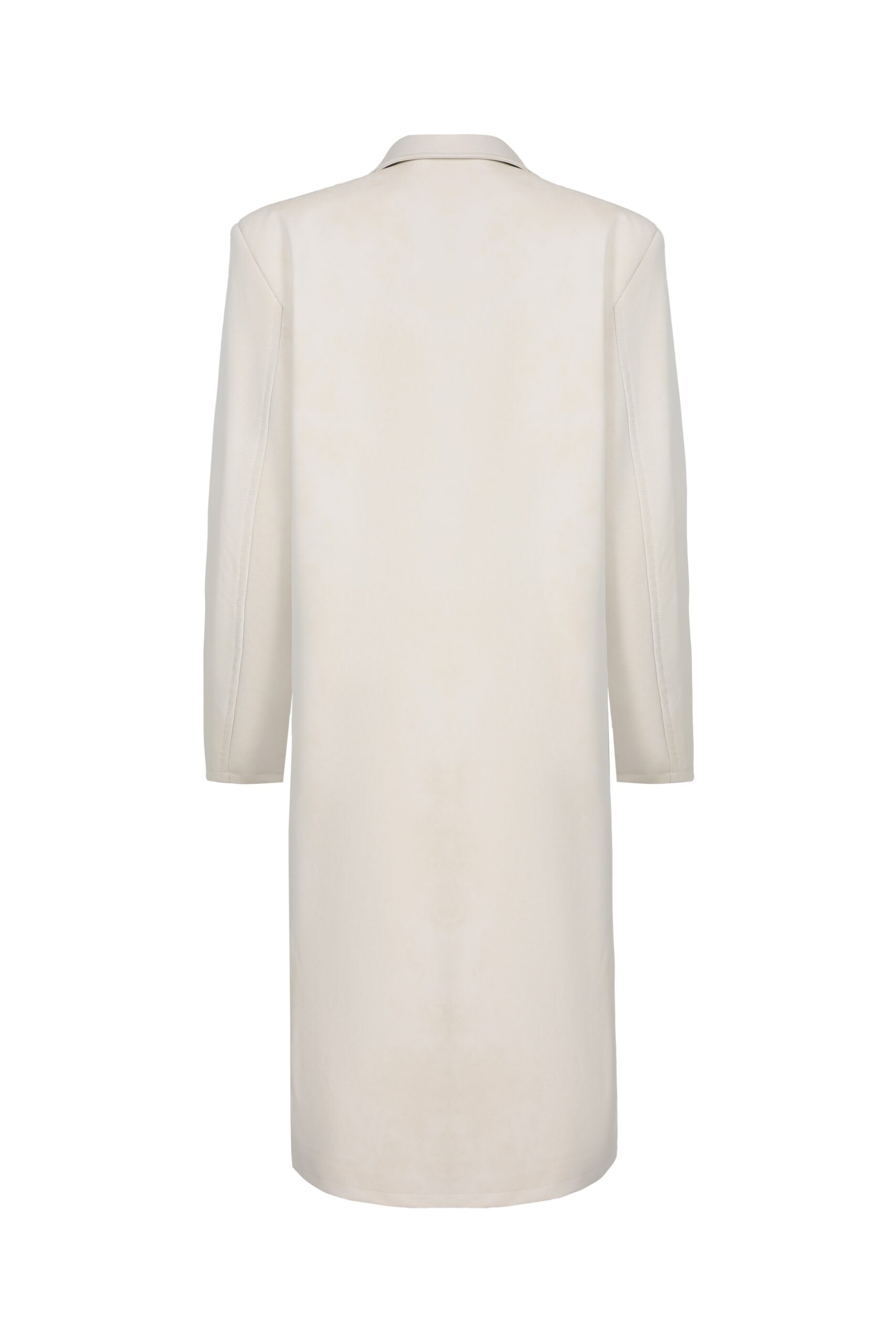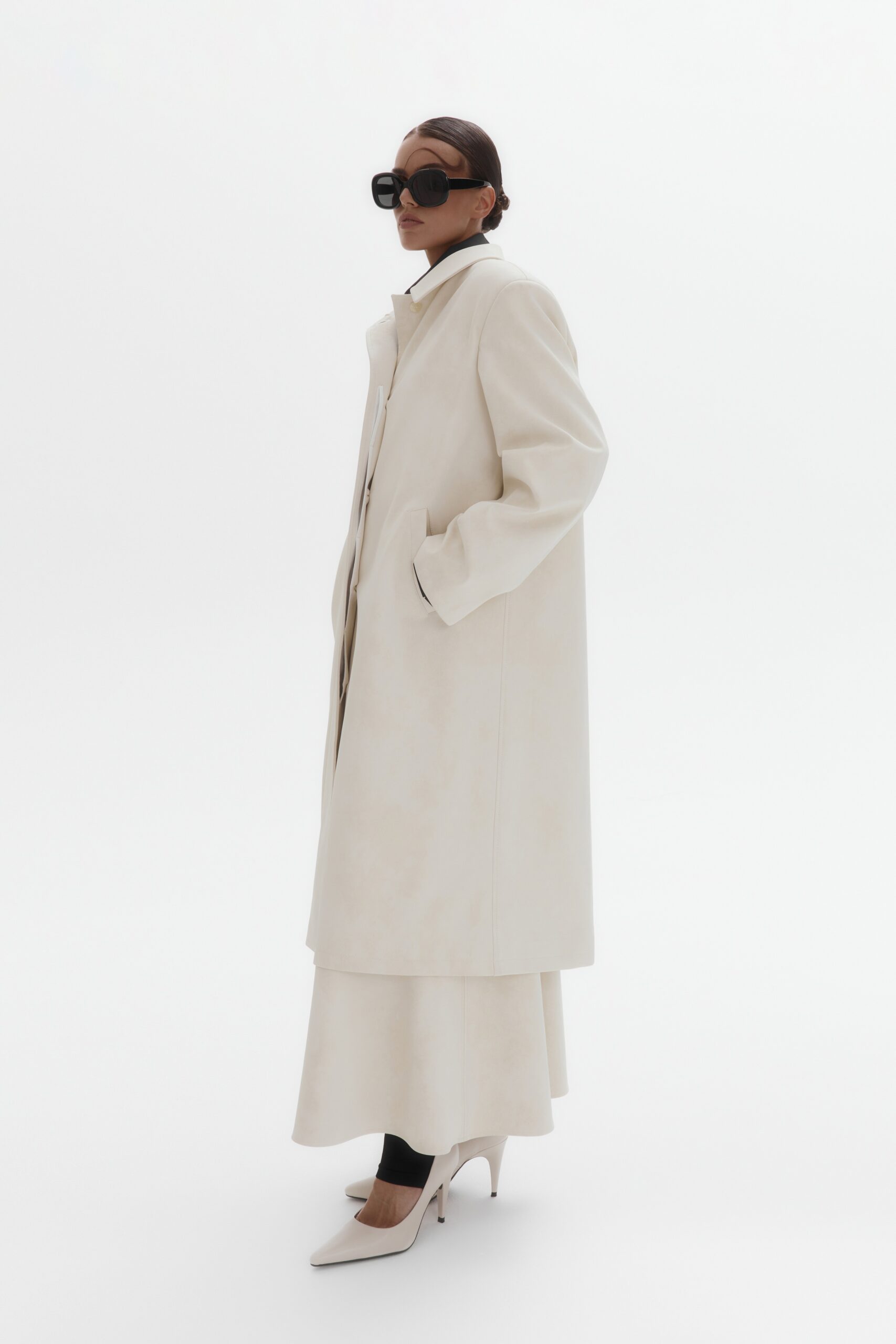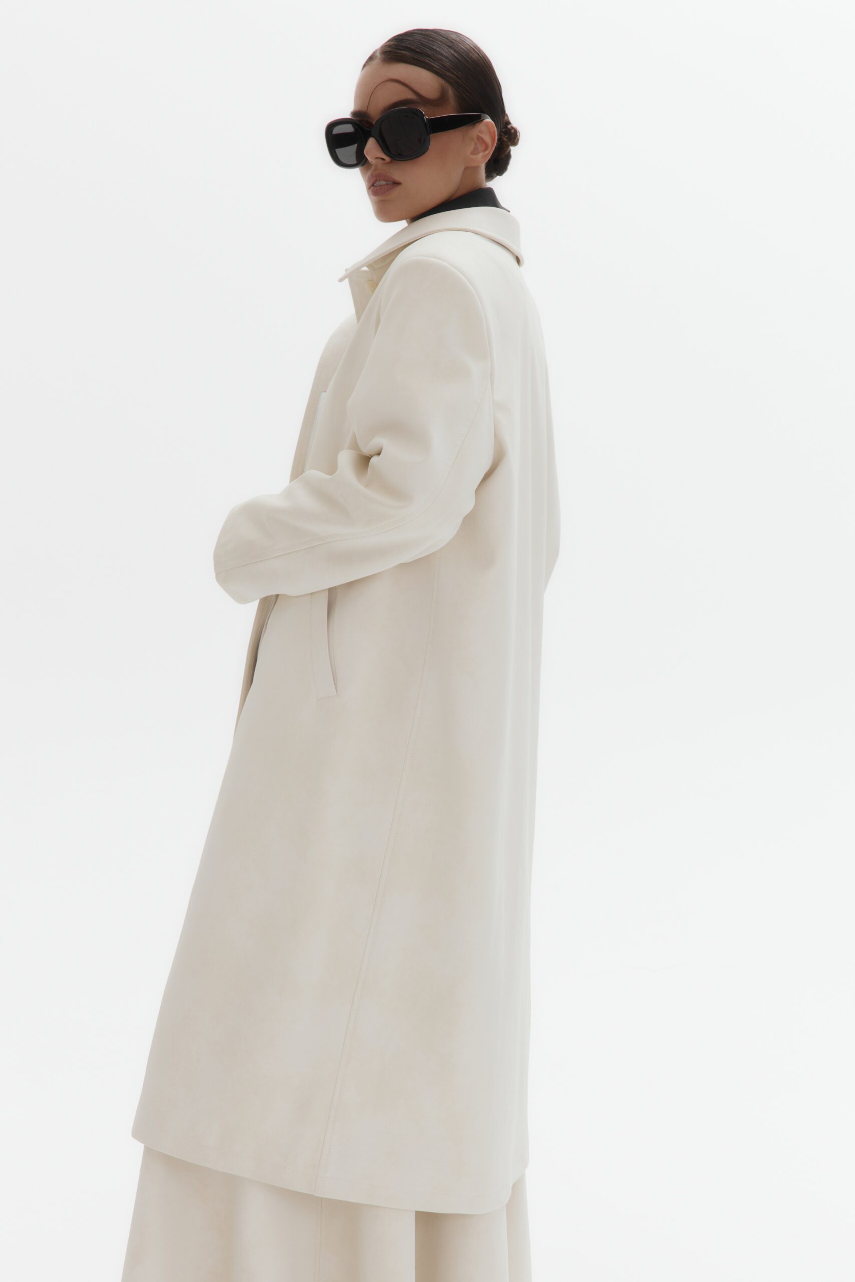 Сдержанный тренч молочного оттенка, из искусственной кожи с благородной бархатистой текстурой. Модель отличает чистый минималистичный крой, скрытая супатная застёжка и акцентная пуговица на горловине. Вечная классика в современной интерпретации. Внутри тренч полностью обработан подкладом.