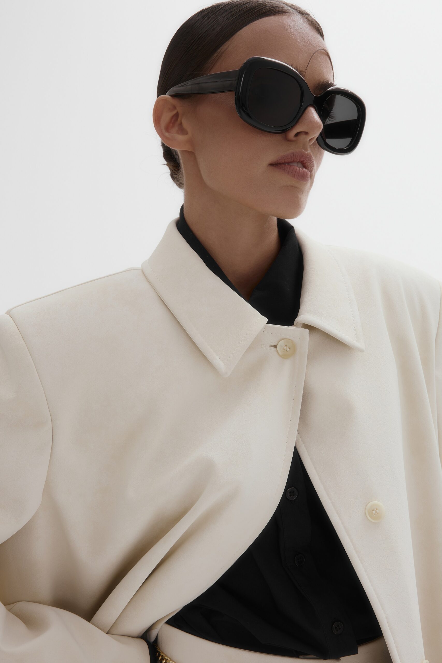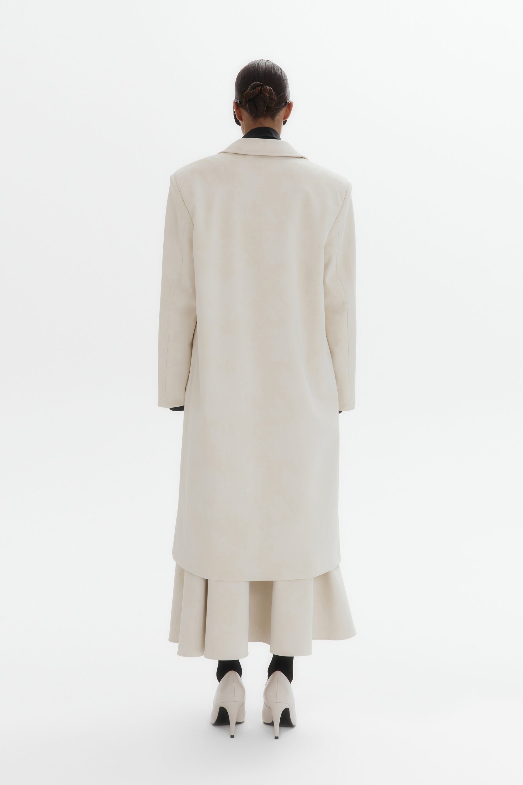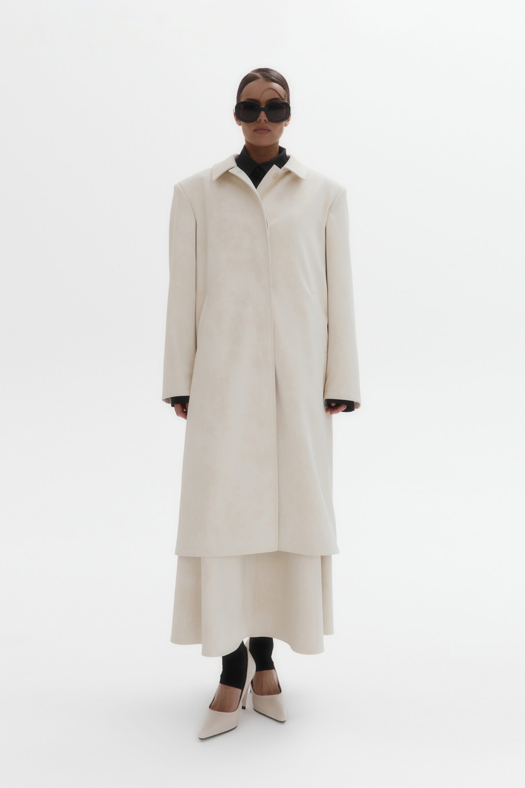Сдержанный тренч молочного оттенка, из искусственной кожи с благородной бархатистой текстурой. Модель отличает чистый минималистичный крой, скрытая супатная застёжка и акцентная пуговица на горловине. Вечная классика в современной интерпретации. Внутри тренч полностью обработан подкладом.