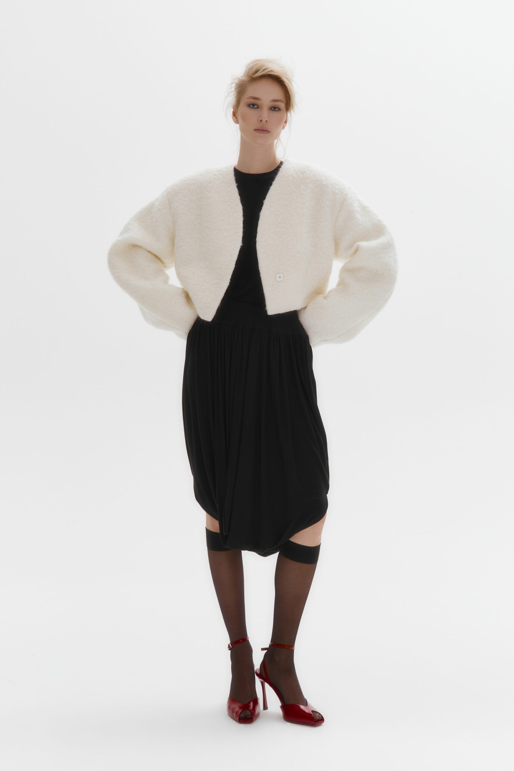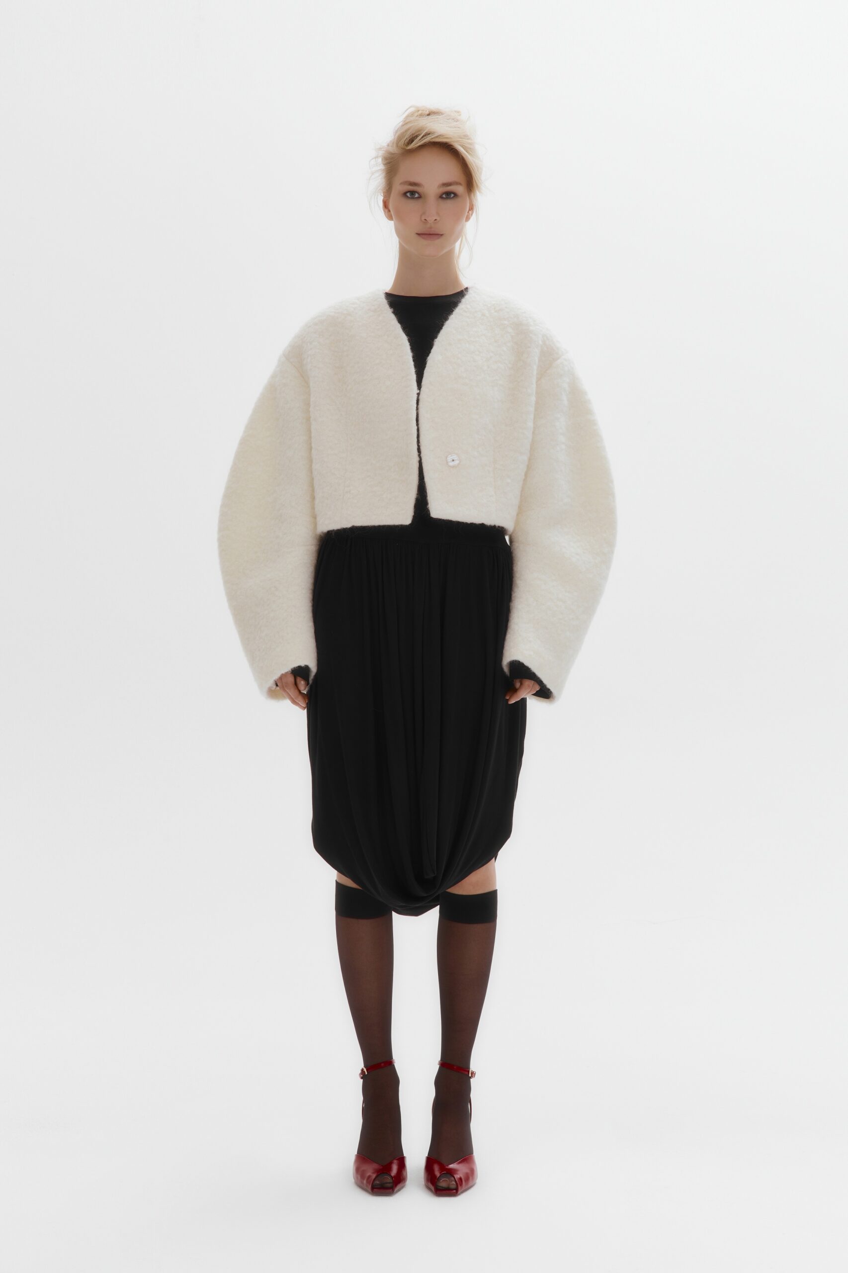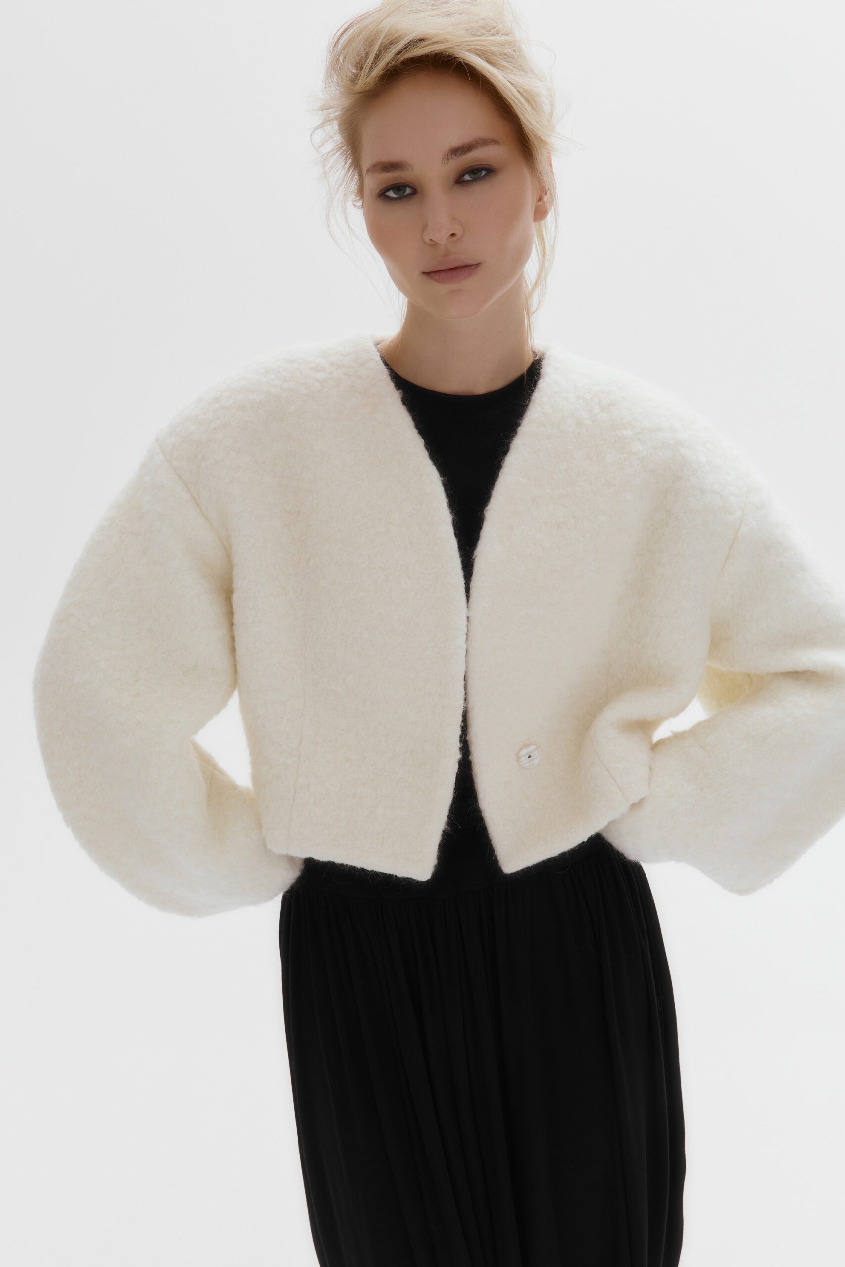 Укороченный жакет O-силуэта из шерсти и мохера в молочном оттенке - стильный и уютный элемент гардероба. Вытачки на жакете подчеркивают фигуру, а объемные рукава, придают модели современный и свободный вид. Сочетание шерсти и мохера обеспечивают тепло и комфорт, а нейтральный цвет позволяет легко сочетать жакет с любыми образами.