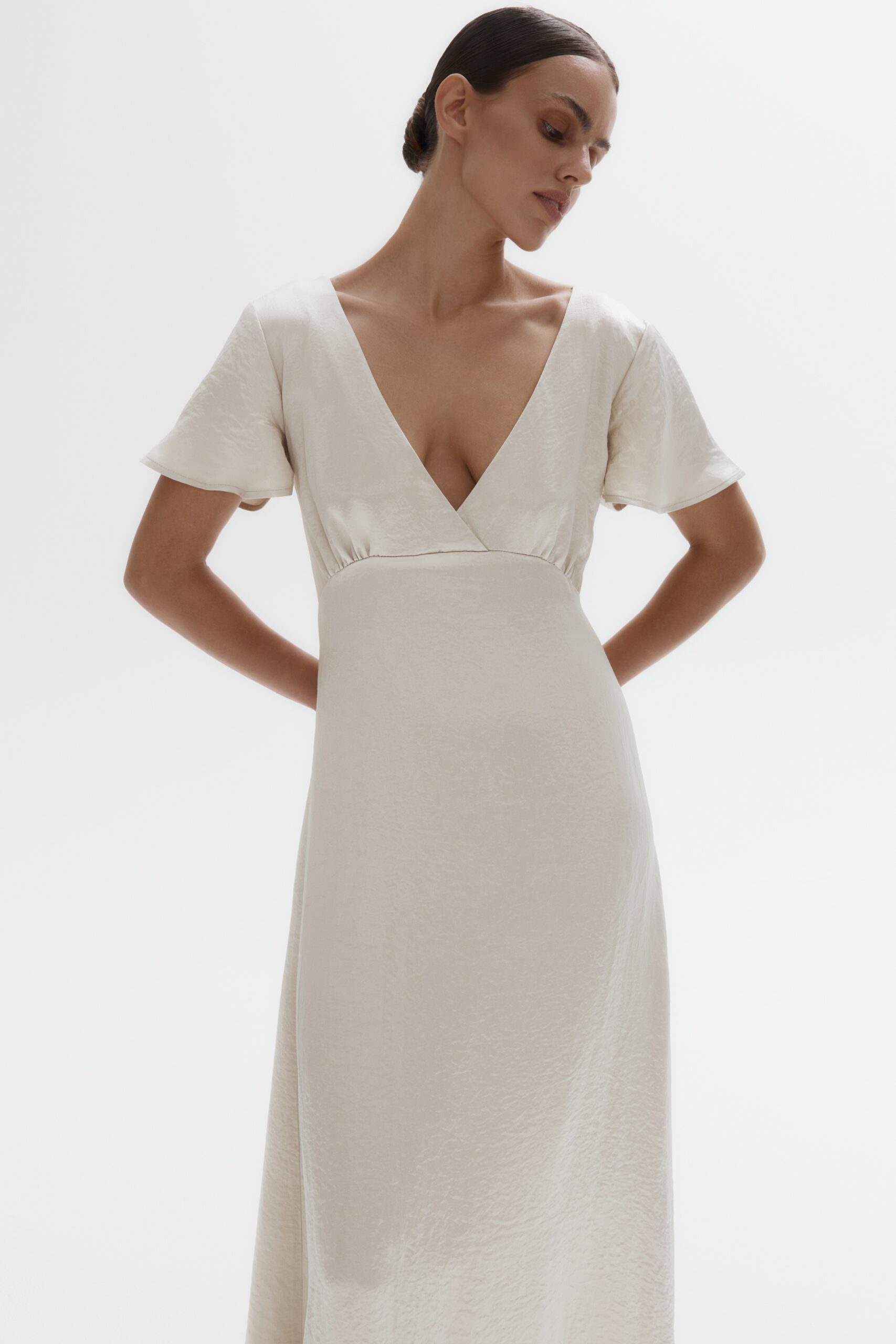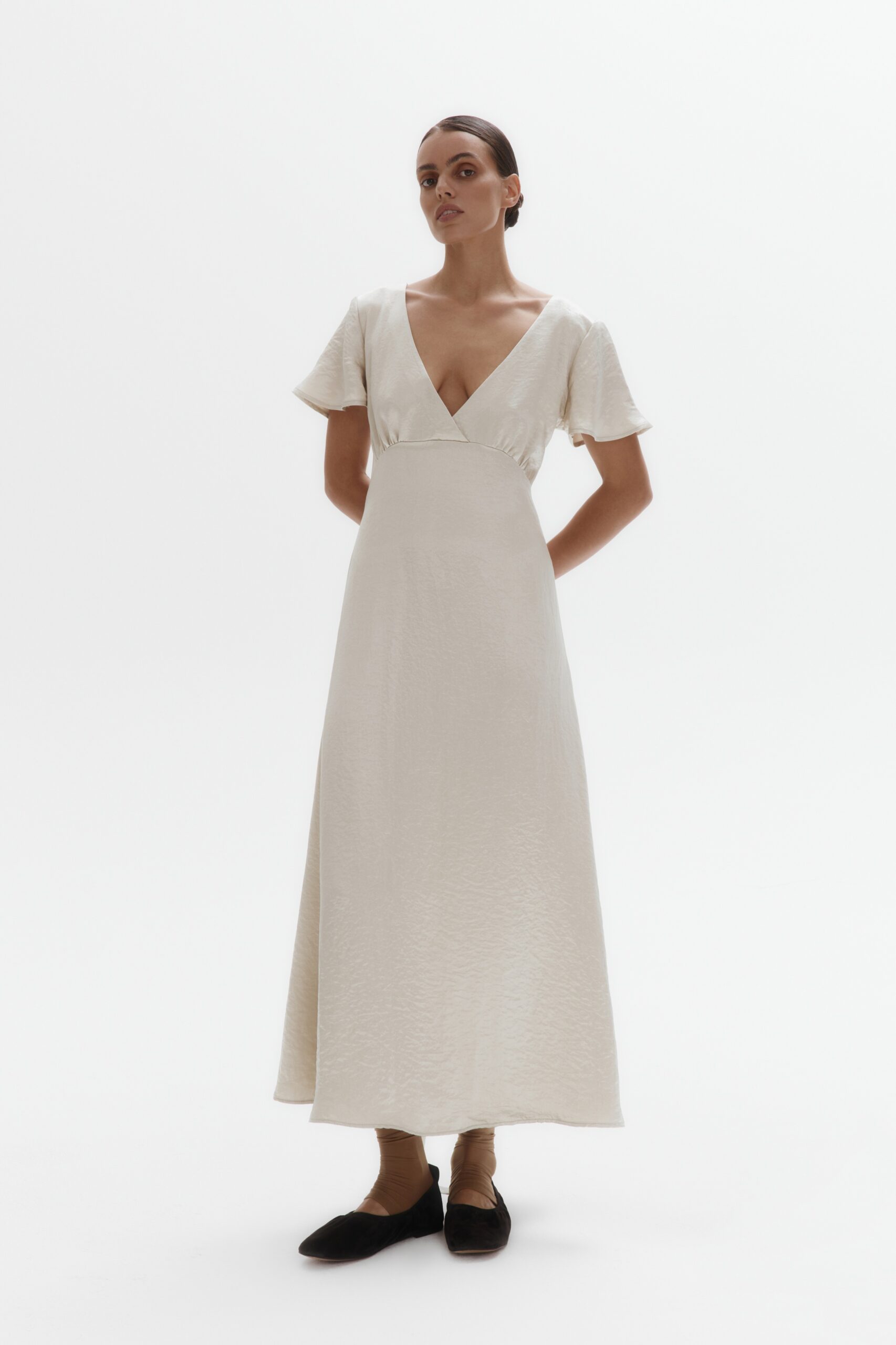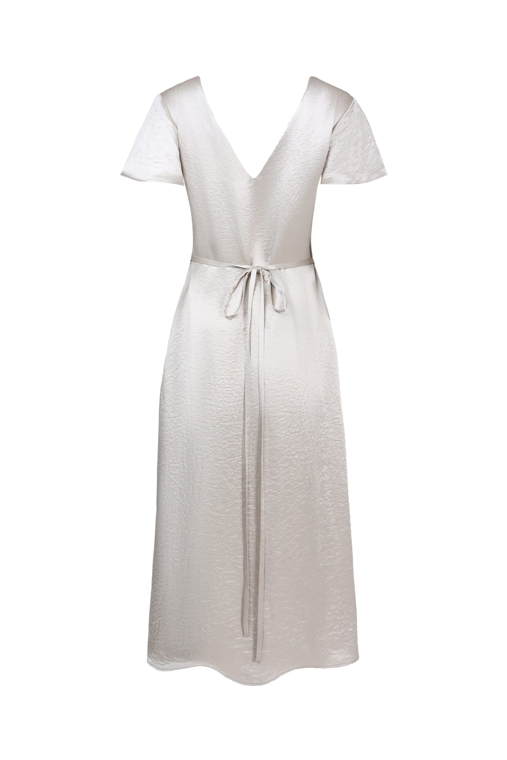 Лёгкое платье, где намёк на откровенность в деликатном вырезе и открытой спине гармонично сочетается с поэтичными деталями: воланами на рукавах и изящным поясом, подчёркивающим талию.