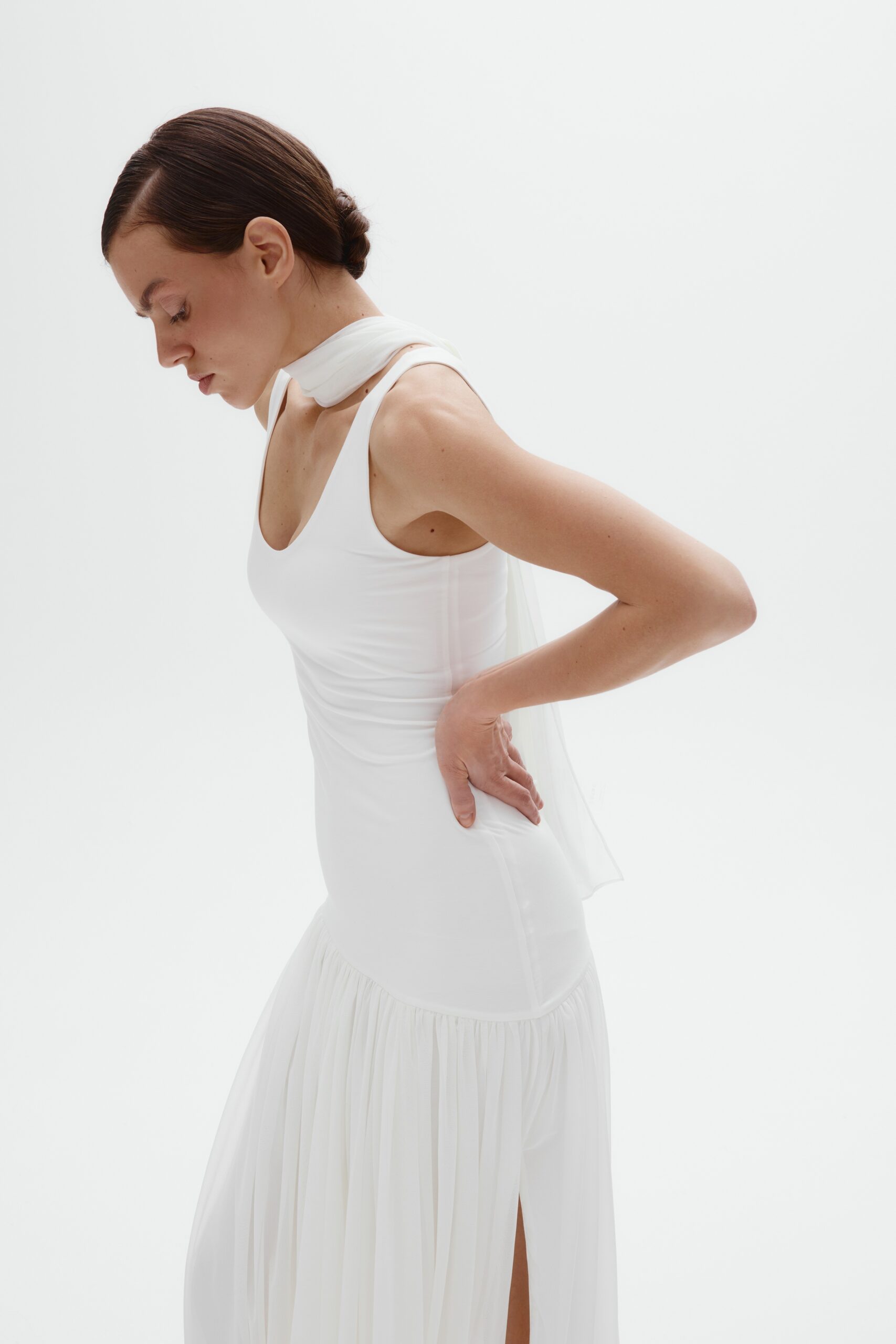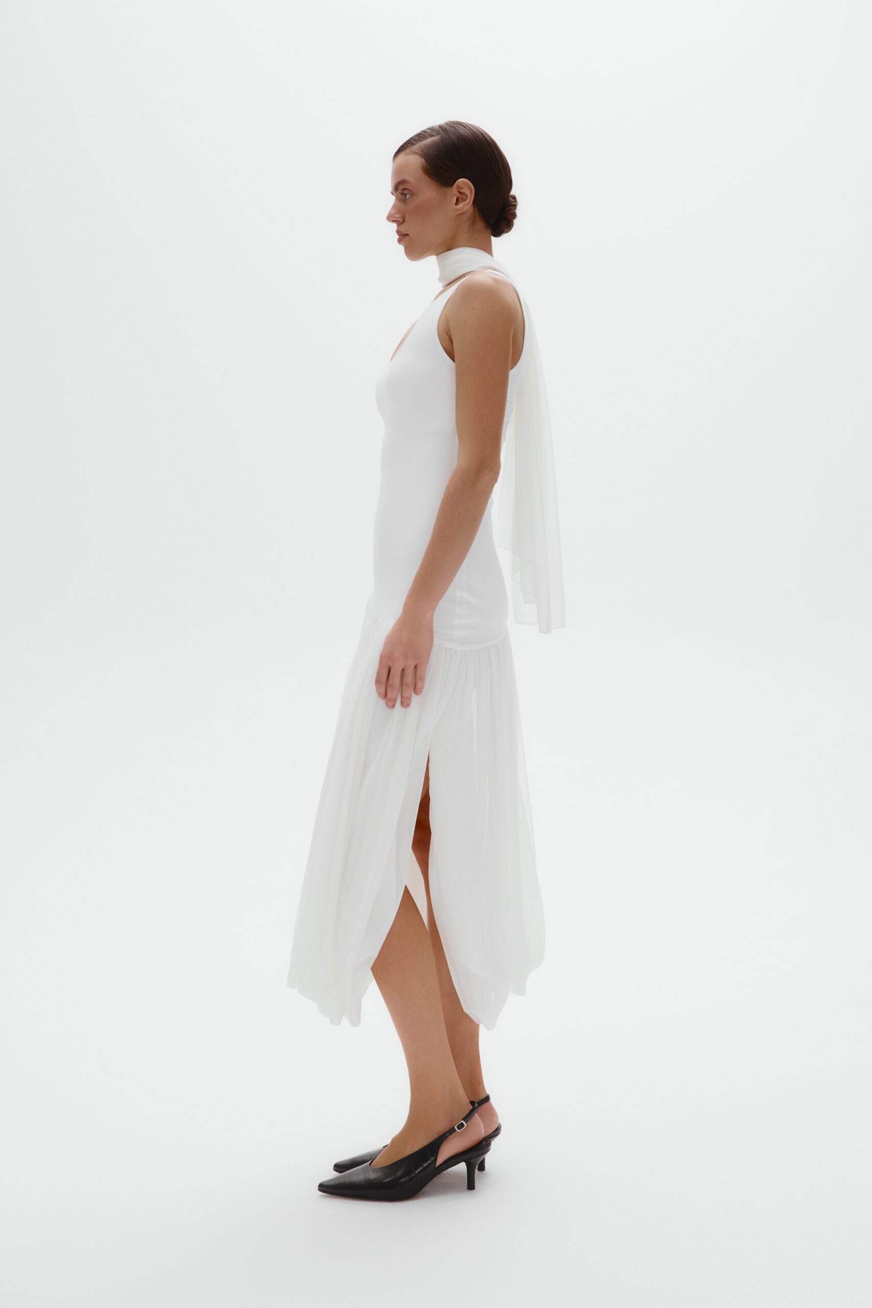 Нижняя часть - пышная юбка. По бокам заложены разрезы, добавляющие движению легкости и делающие силуэт менее статичным. В комплекте к платью идет шарф-вуаль. Конструкция продумана так, что графичность топа уравновешивается объемом юбки, создавая выразительный женственный силуэт с четкой архитектурой.