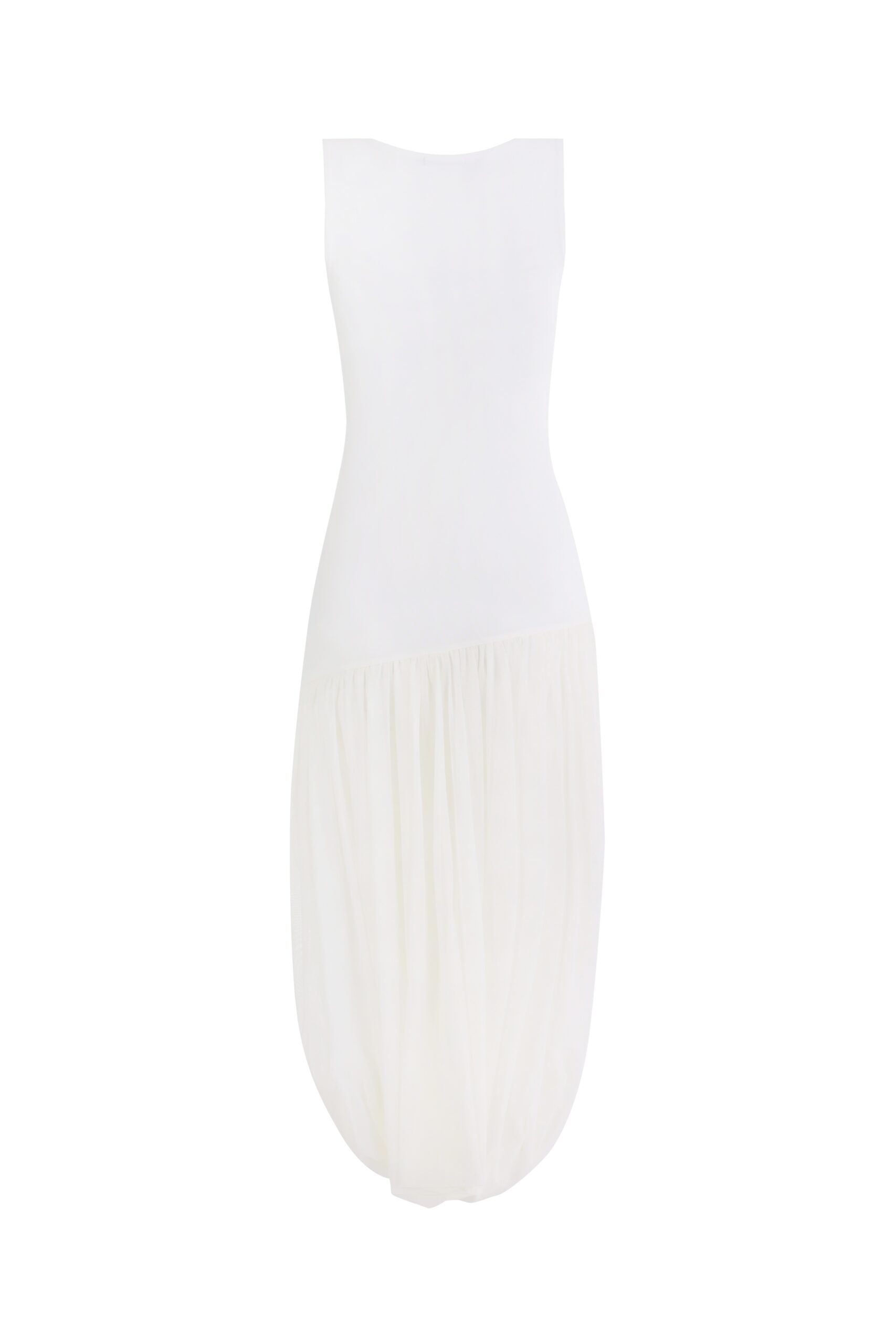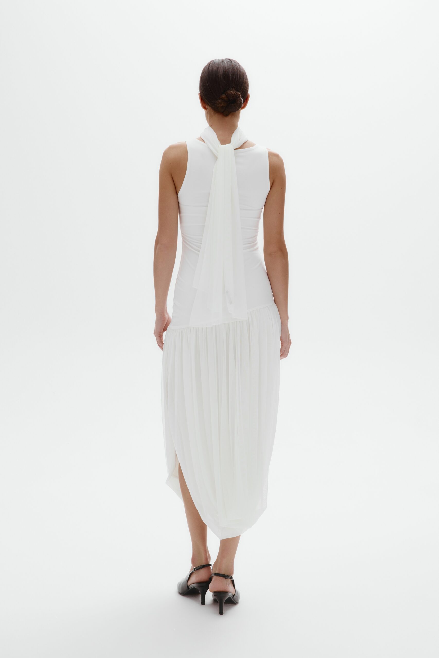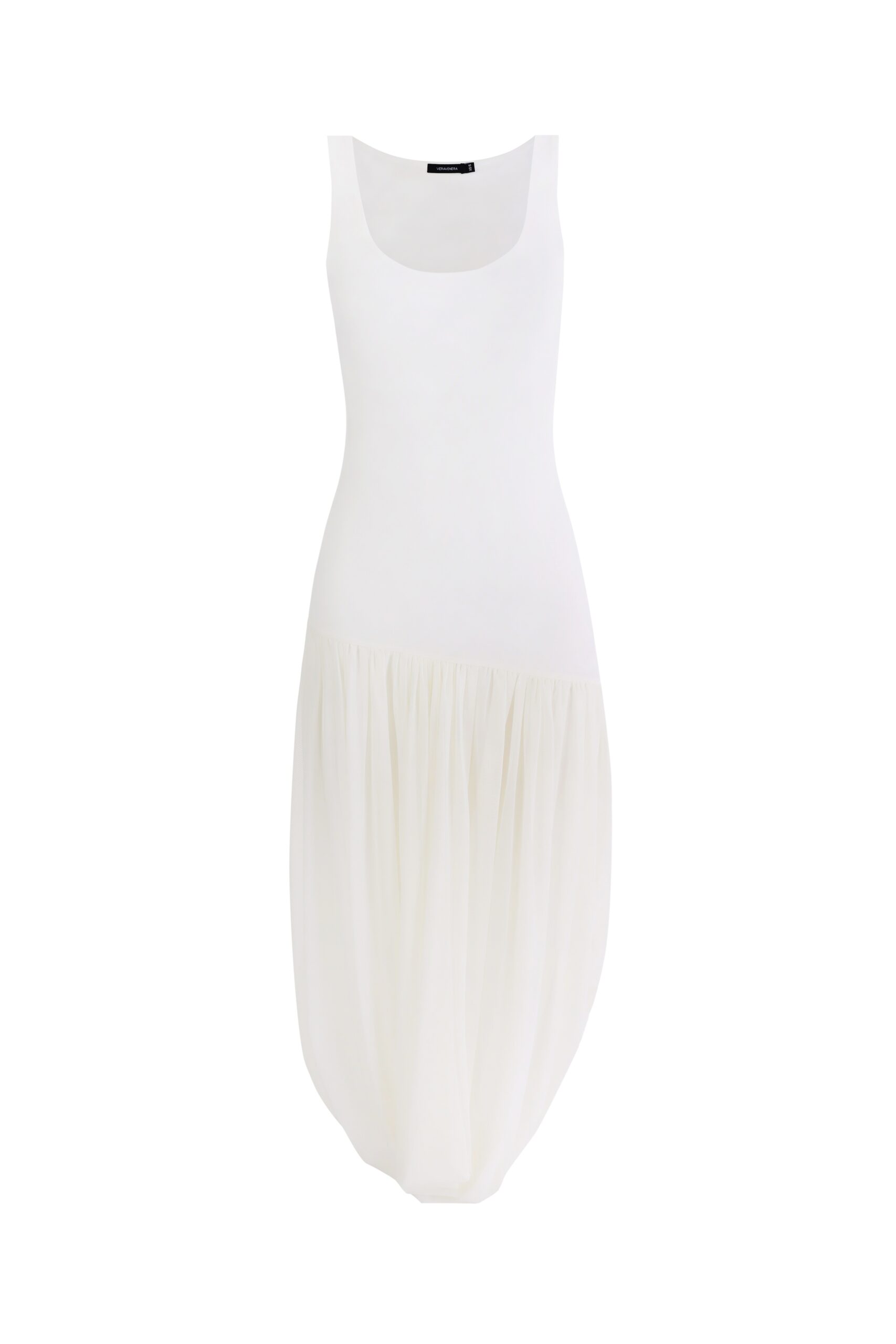 Модель, построенная на контрасте форм. Верх выполнен в формате лаконичной майки, открывающей линию плеч и ключиц.