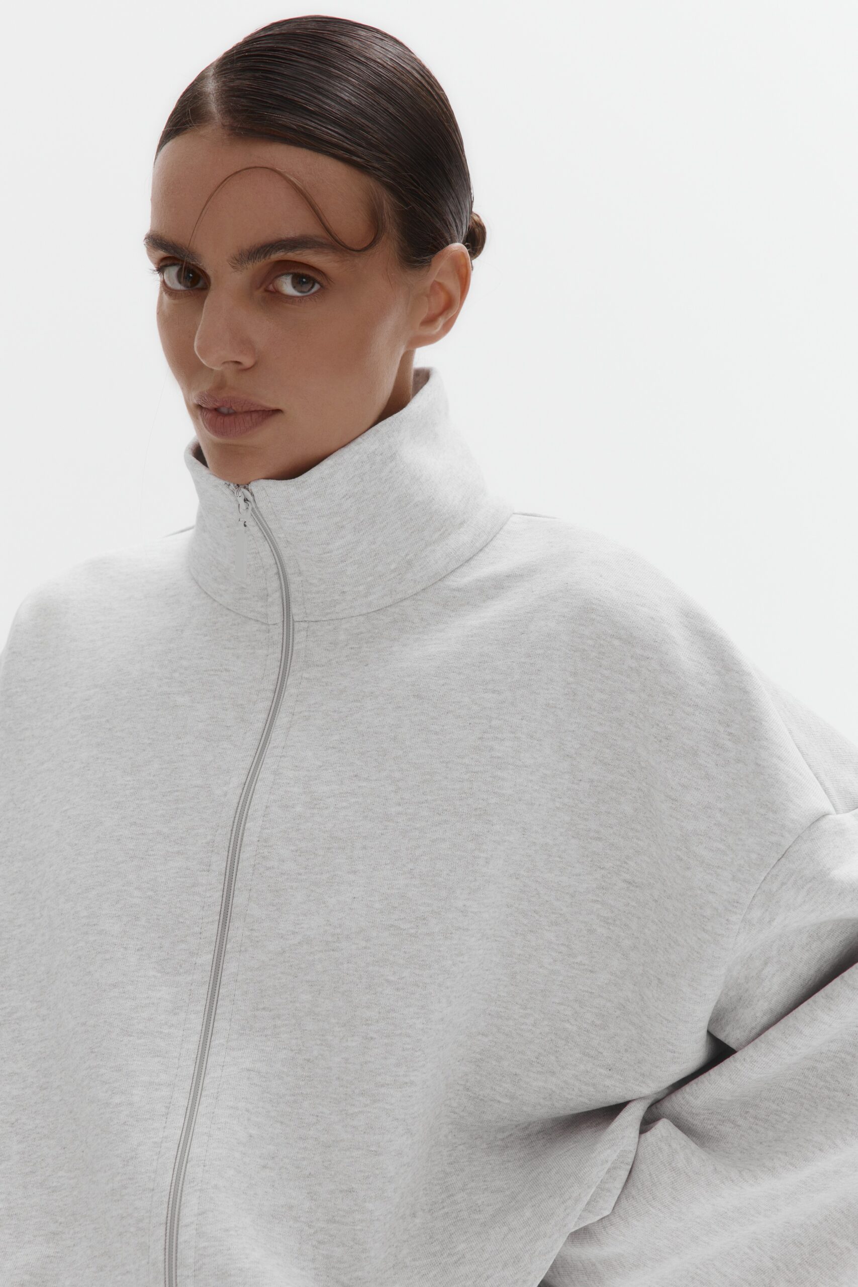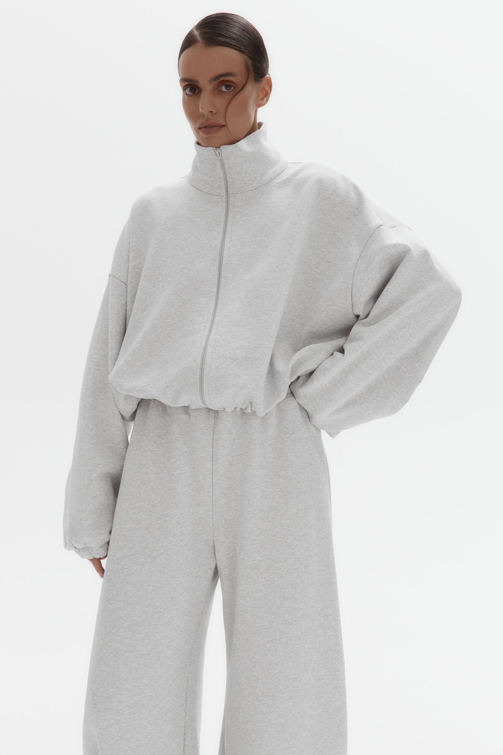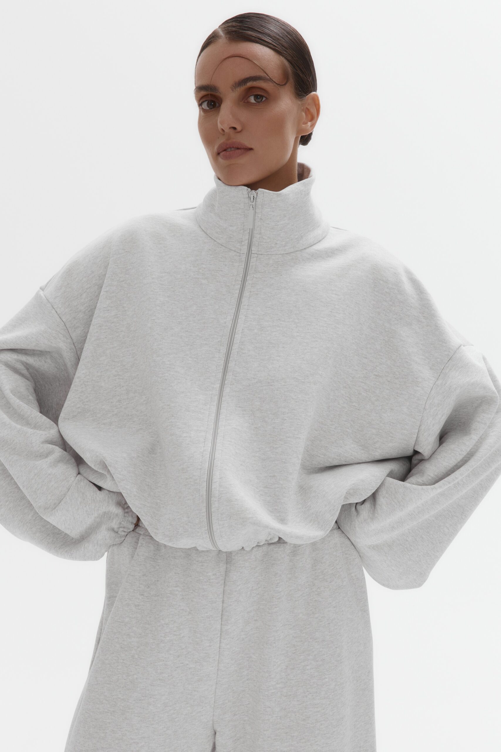 Стильный укороченный full-zip свитшот с петельной текстурой без начеса. Модель с удобной молнией, воротником-стойкой и регулируемыми кулисками на рукавах и по низу.