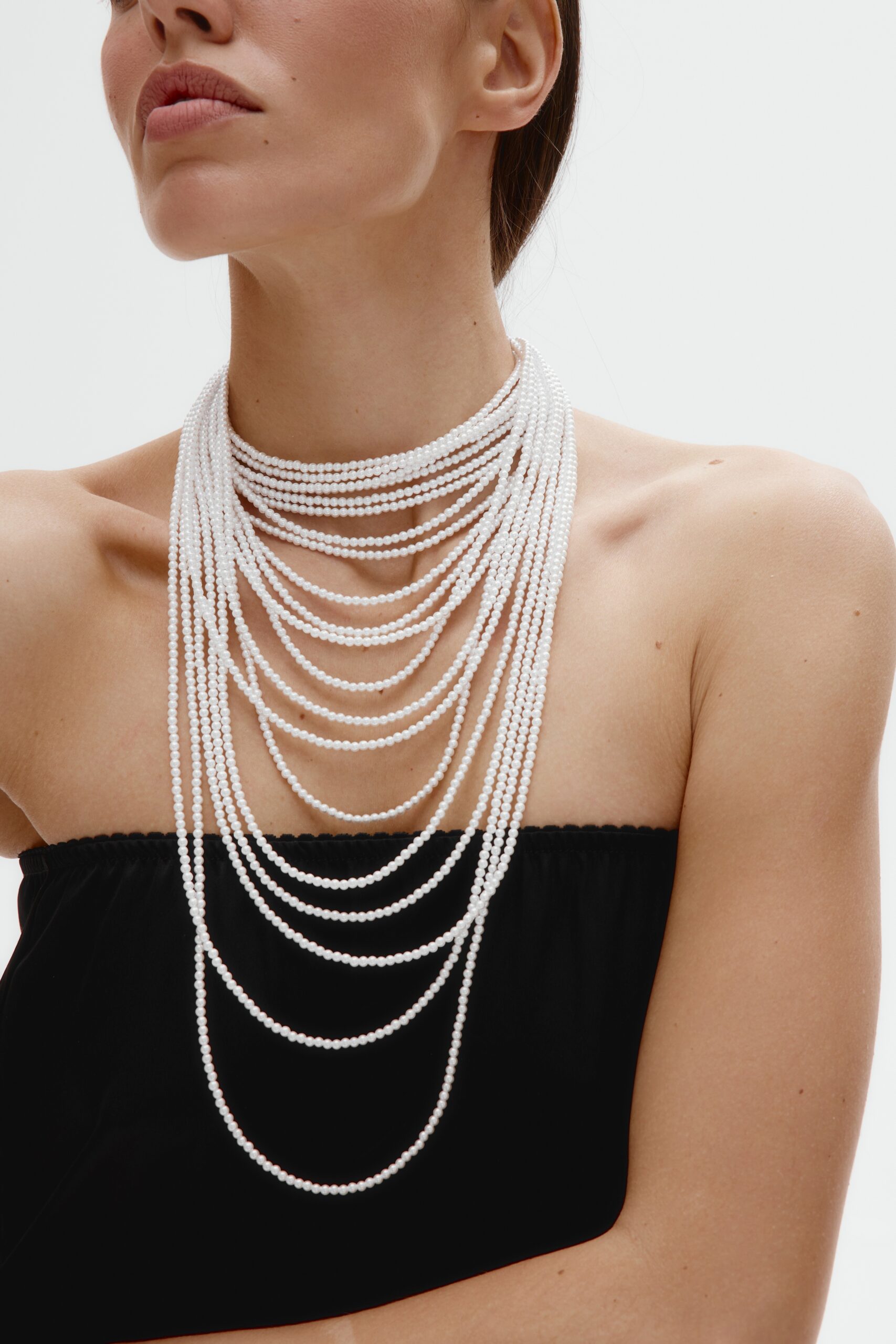Ожерелье из тонкой Майорки, создающее иллюзию драпированной горловины. Скульптурные складки, отсылающие к античным туникам, придают образу авангардную динамику и роскошный объем.