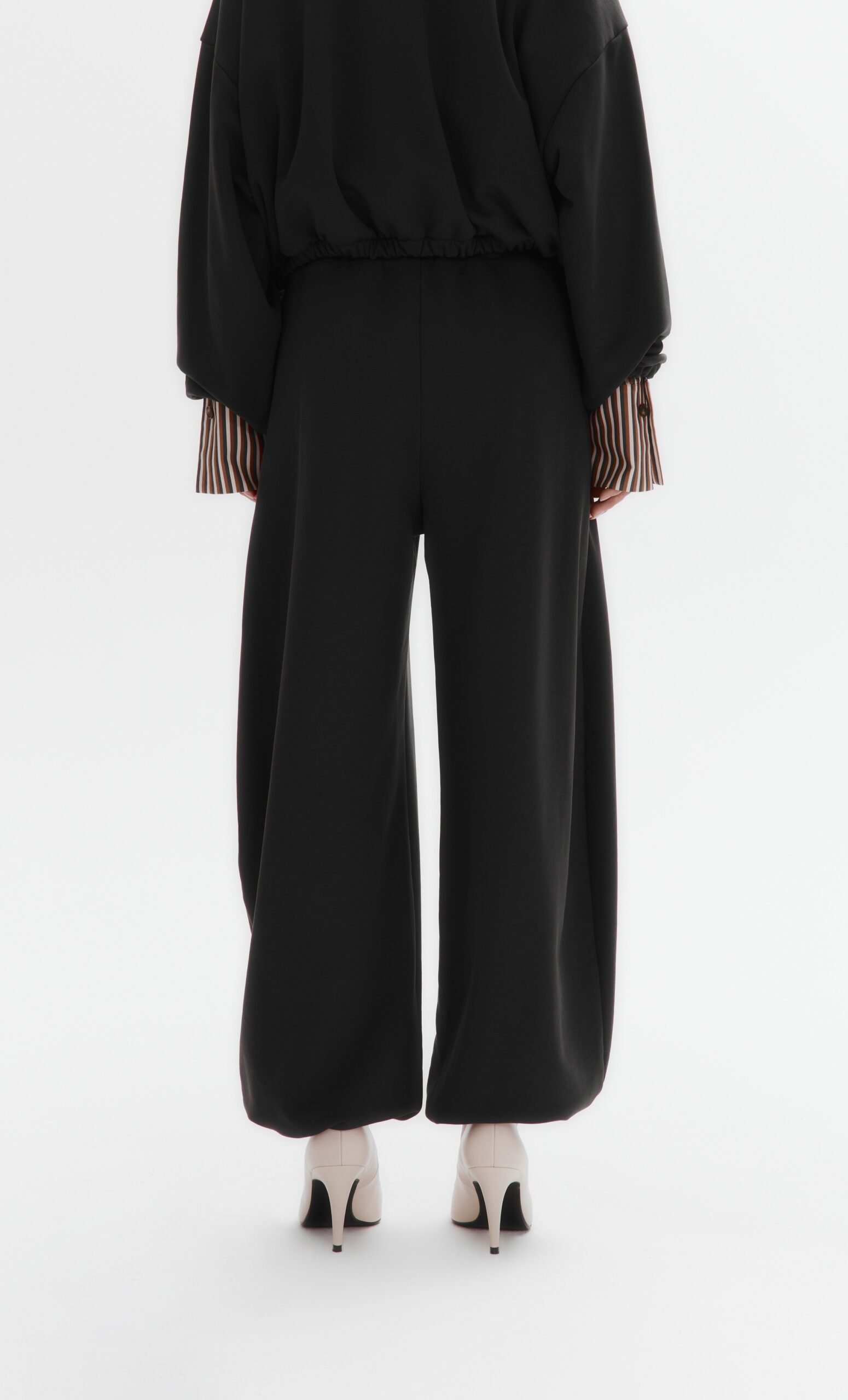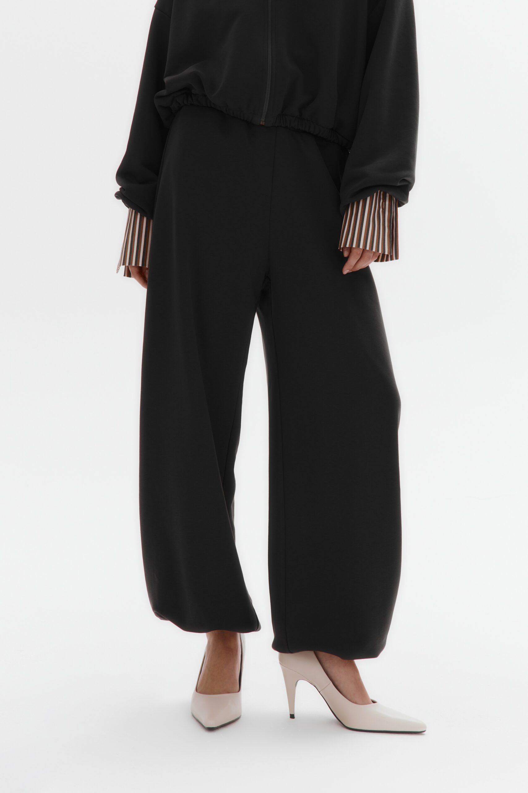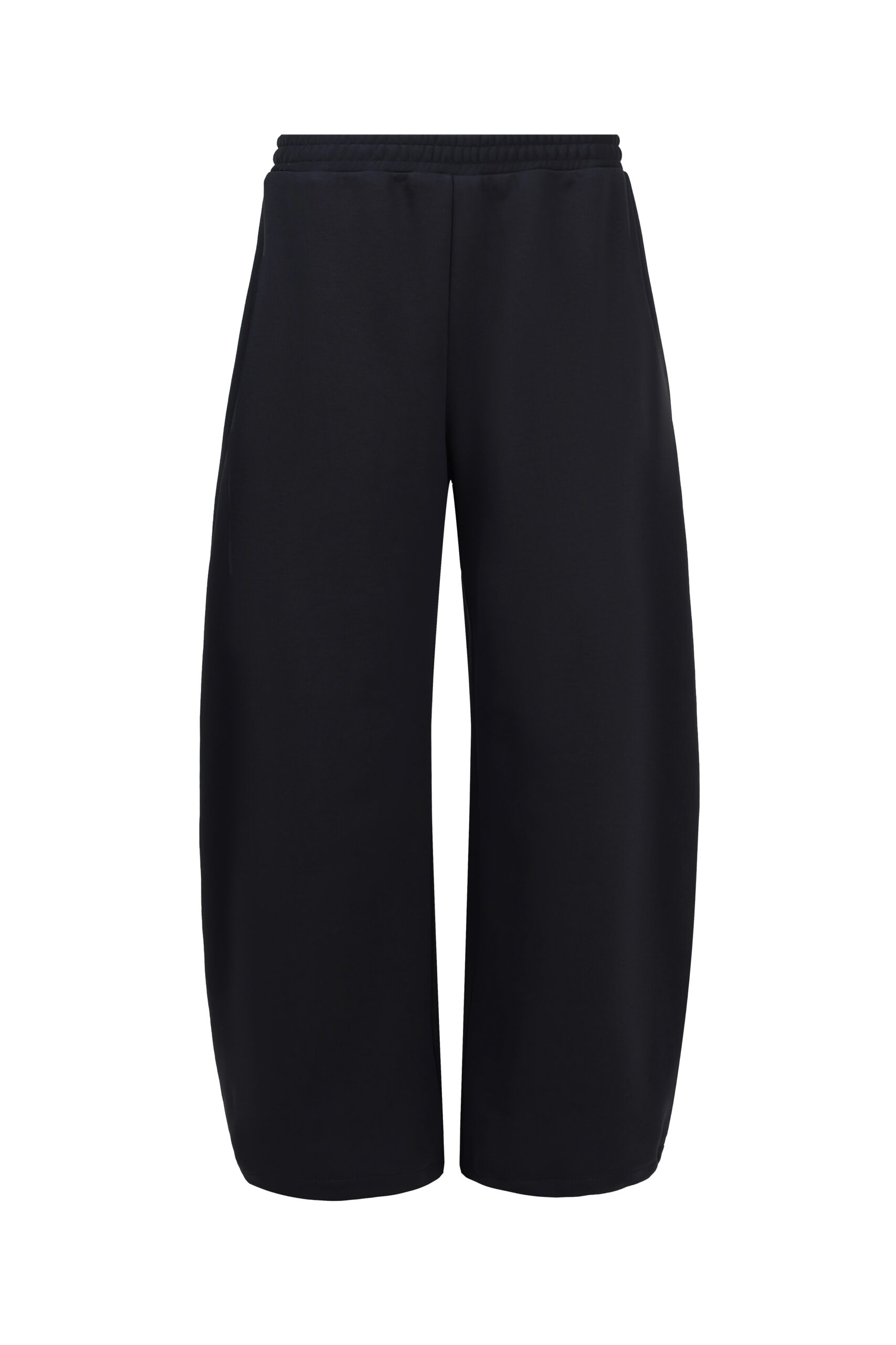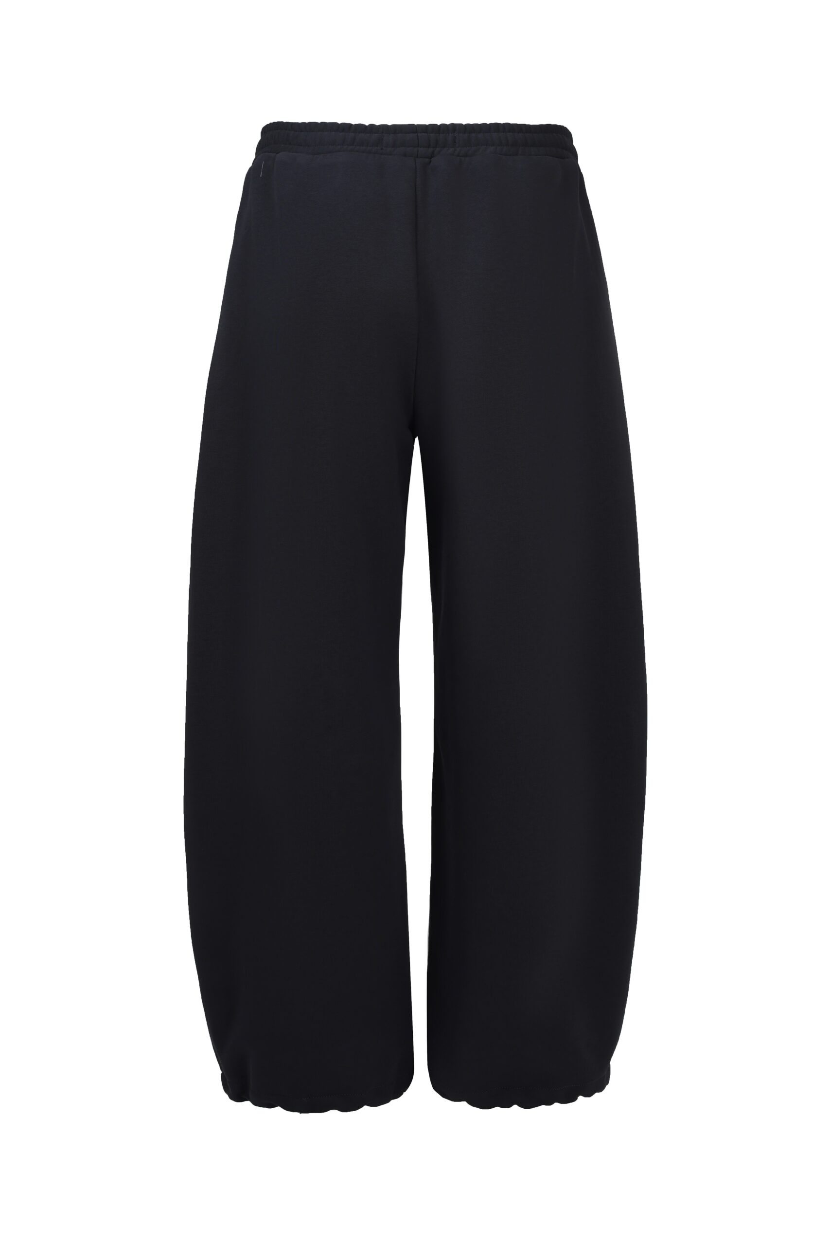 Уютные брюки о-силуэта из плотного хлопкового футера без начеса. Низ брючин - с кулиской на шляпной резинке, которая затягивается изнутри.