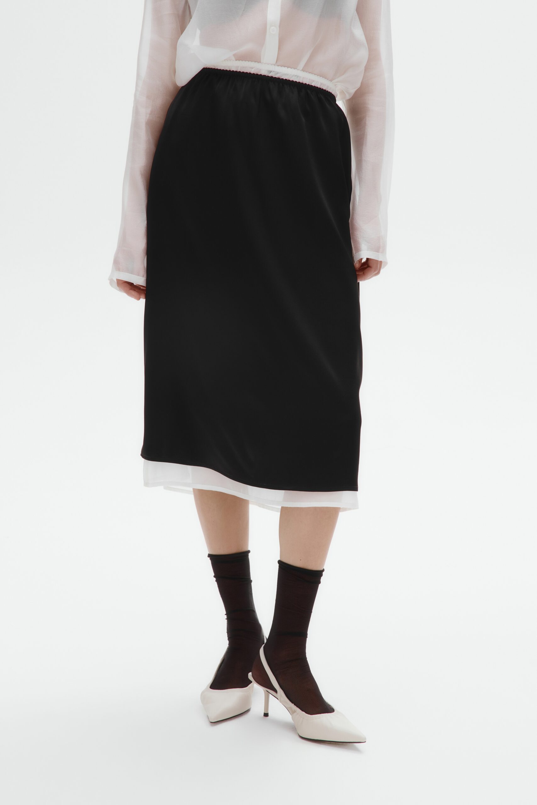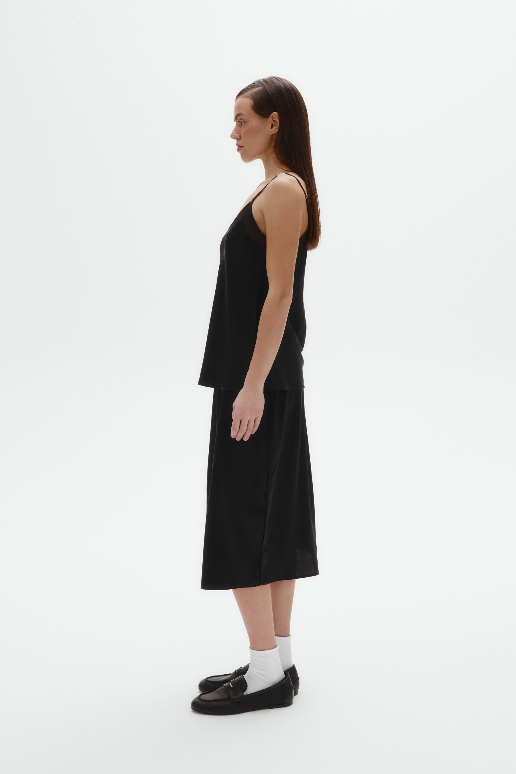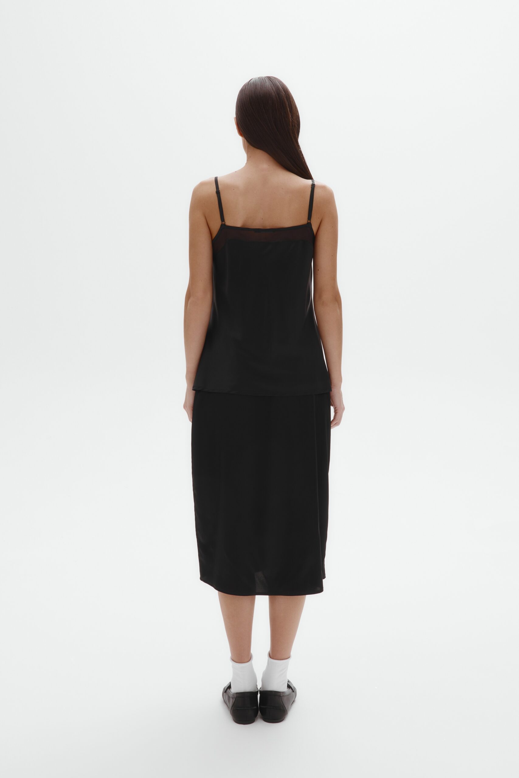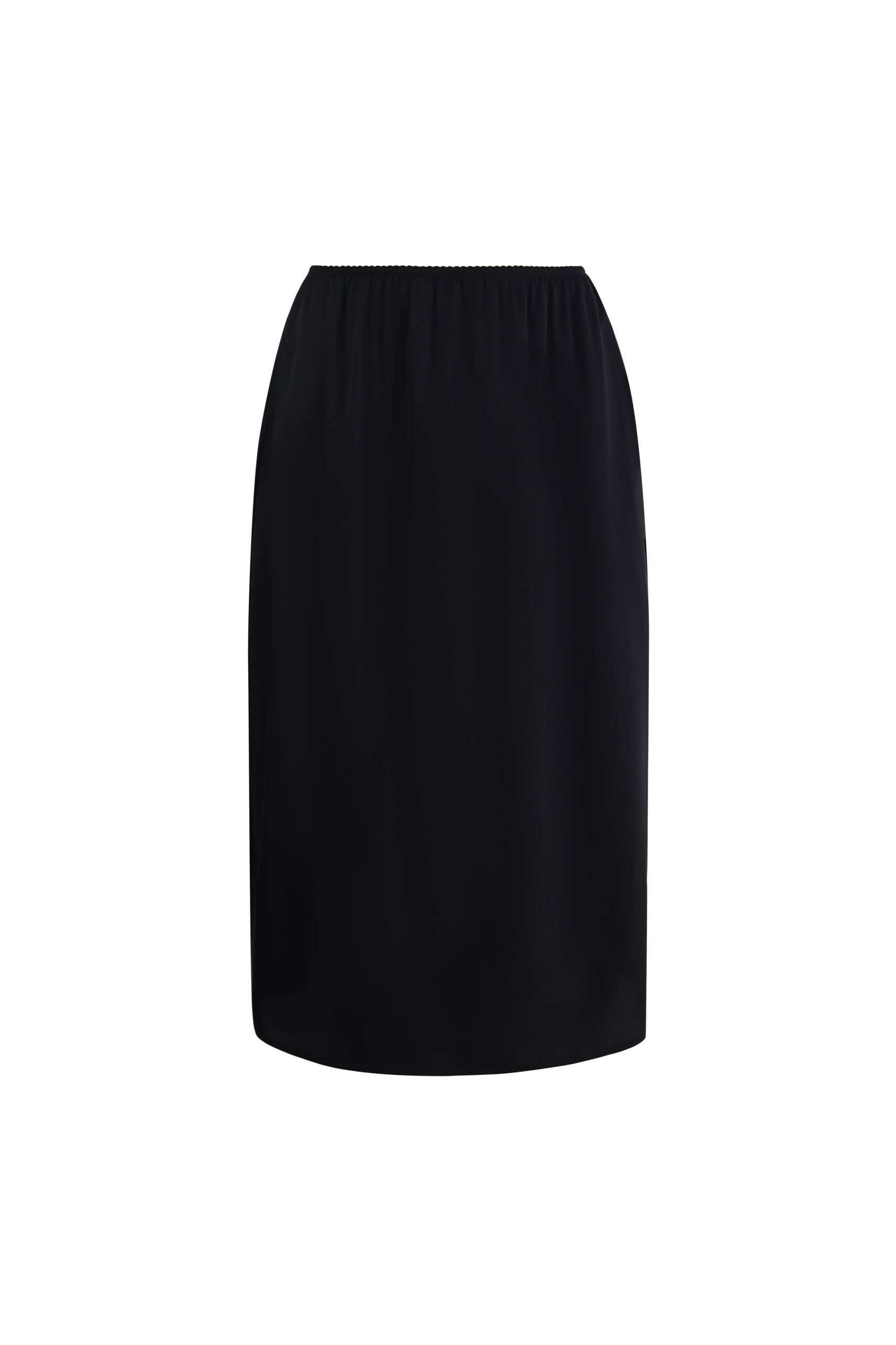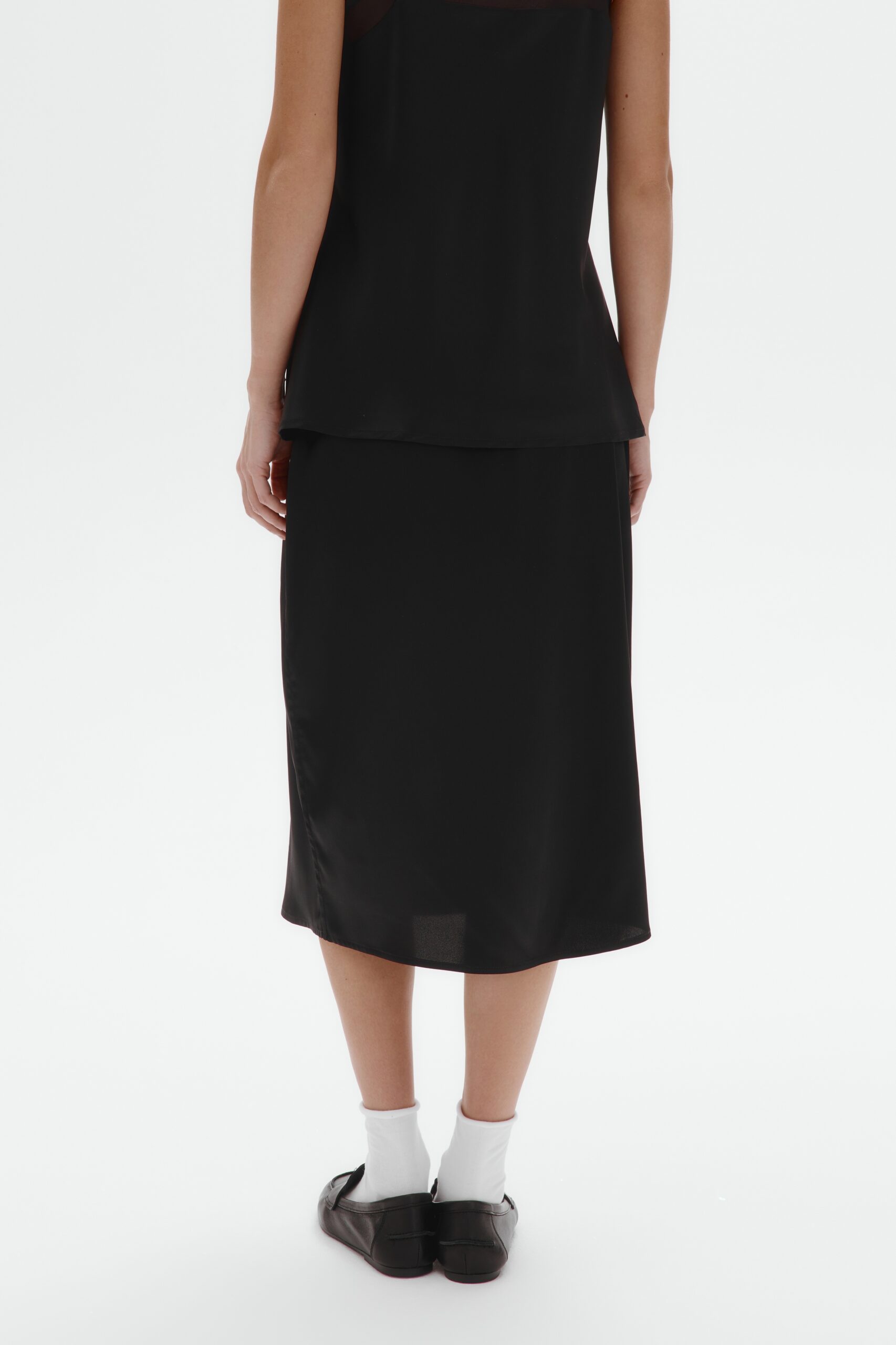 Шелк в этой модели задает тон - мягкий, струящийся, с деликатным блеском. У юбки длина миди и прямой крой, который не сковывает движений, а лишь обозначает силуэт. Посадка на эластичном поясе обеспечивает комфорт и чистоту линии - никаких застежек, только ткань, ложащаяся естественными складками. При каждом шаге шелк приходит в движение, делая образ текучим и живым. Край обработан аккуратным подгибом, сохраняющим невесомость материала.