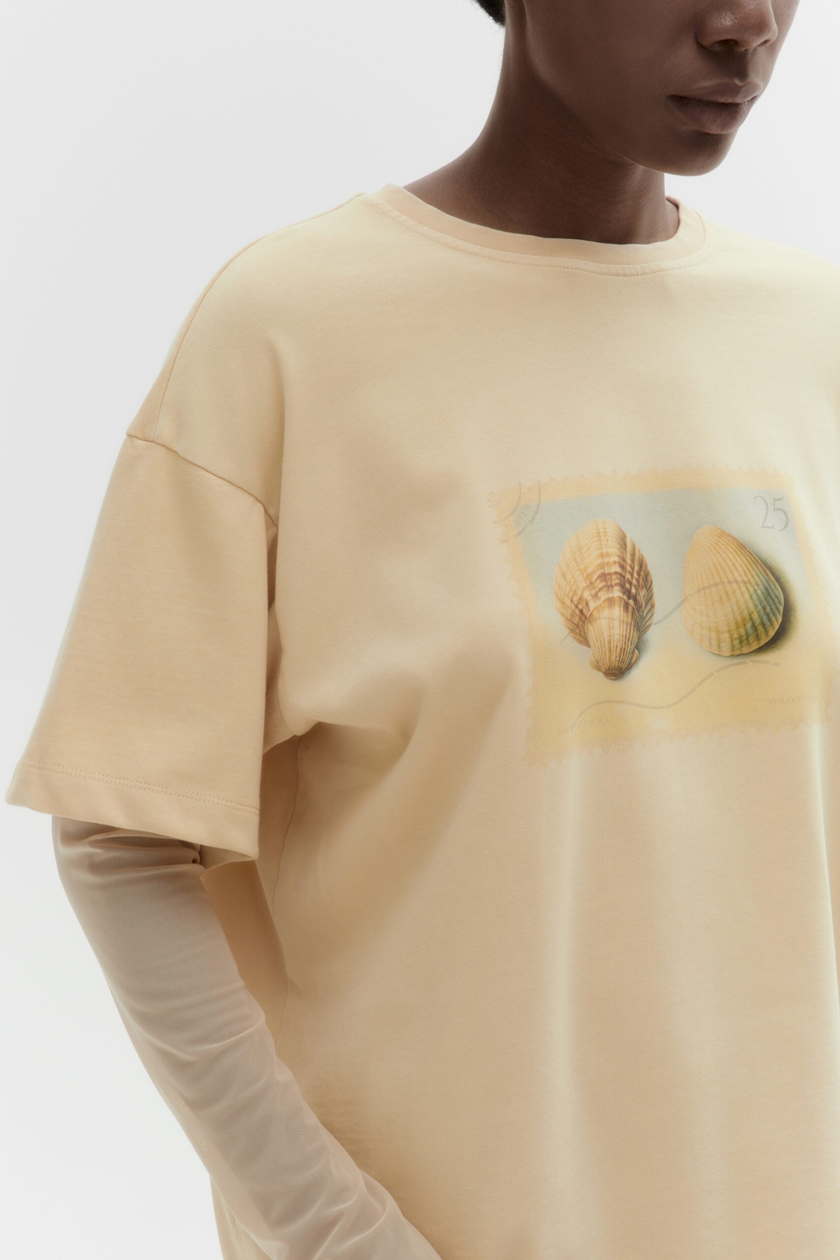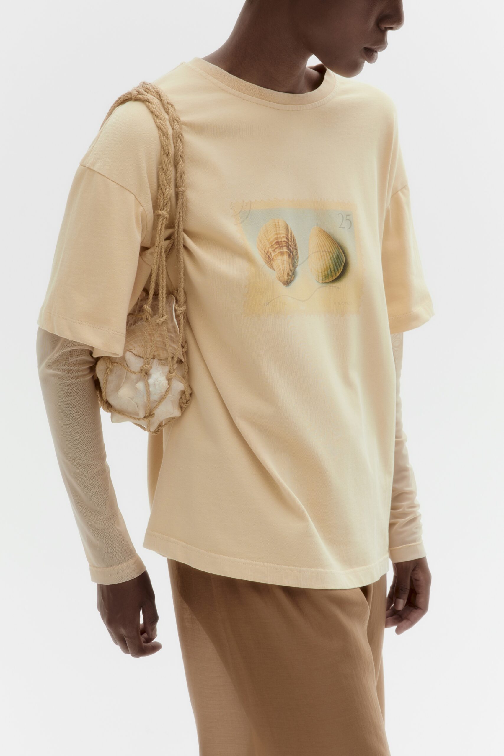 Лонгслив THE SHELL POST с вареным эффектом. Мягкая сетчатая ткань рукавов и ретро-принт с ракушками в виде почтовой марки на груди создают атмосферу морских путешествий и старинной переписки.